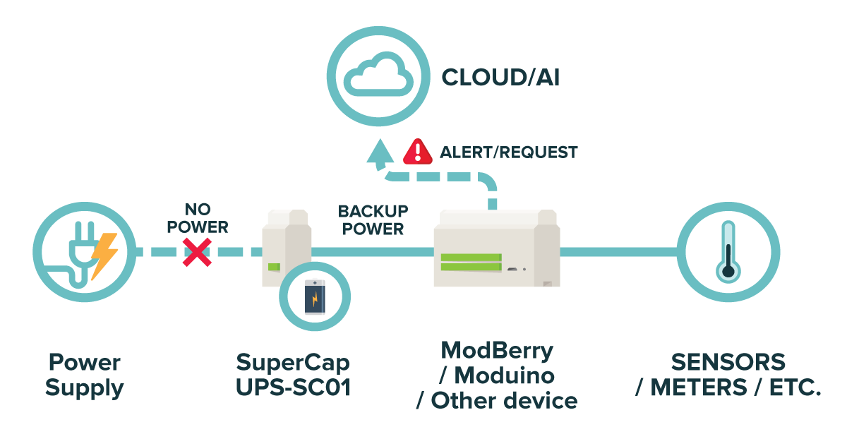 As an addition to Industrial IoT family of TECHBASE’s products, such as ModBerry (Raspberry Pi Compute Module 3 powered) industrial gateways and Moduino (ESP32 powered) end-point devices, the SuperCap UPS serves well as an additional, highly efficient and fanless power source to allow continuous operation of connected devices in difficult conditions, such as extended industrial temperature range. Perfect solution for a multi-range applications, especially for embedded IIoT / Industry 4.0 systems, where stability and high availability is most important.